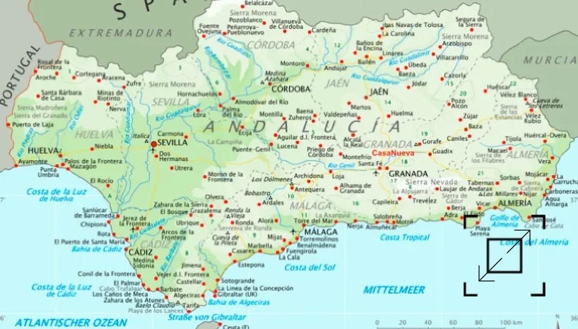 Casa Nueva liegt 13 km von Granada entfernt am Rande der Vega. Der Weg nach Granada, den wir schon gefühlte 1000 mal gemacht haben, führt durch Pinos Puente und Atarfe in die Stadt. Aber seit dem Jahr 2021 gibts die Autovia A43. Sie dient als Umgehung und Entlastung für Pinos und Atarfe. Außerdem verkürzt sie den Weg nach Cordoba. Wenn man nach Casa Nueva fährt, führt die Autovia fast bis zu uns.