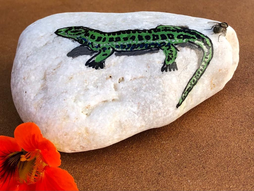 Im Sommer 2021 begann ich unsere reichlich vorhandenen Acrylfarben zu nutzen und die Steinmalerei für mich zu entdecken. Angeregt durch sehr positive Resonanzen auf Instagram und Facebook ist eine schöne Galerie entstanden. Auch der farbenprächtige Blumentopf gehört inzwischen in unseren Patio. In diesem Jahr 2023 habe ich den Gel-Druck für mich entdeckt. Einige Beispiele sind unten dargestellt.